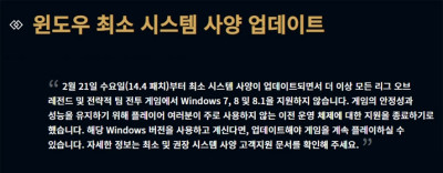 라이엇 게임즈(Riot Games)는 2024년 2월 21일 윈도우 7과 8 그리고 8.1의 공식 지원을 종료하였습니다.